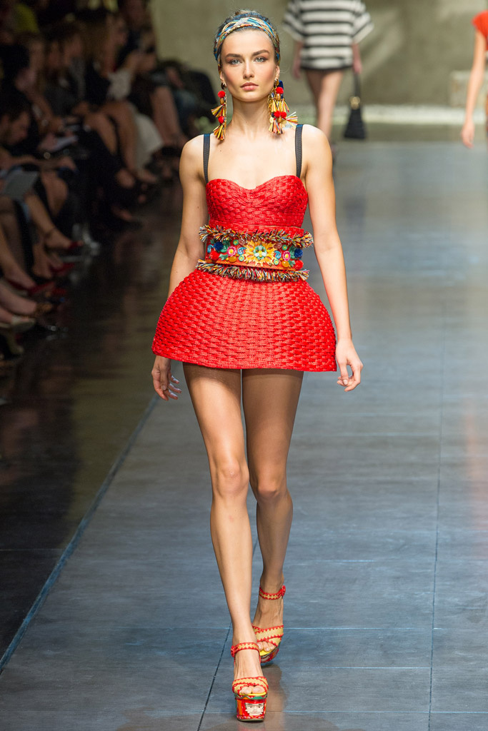 Por su parte la vibrante colección de D&G está inspirada en la Sicilia profunda y tradicional. Los vestidos, dos piezas, camisolas, sandalias de plataforma y planas, cestas de mimbre, pendientes XXL, etc nos hacen recordar a una Sicilia llena de color, sol y mar.